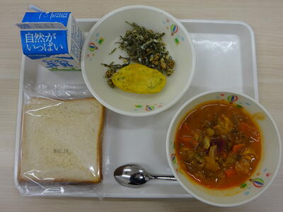 今回は、2014年に開催されたソチオリンピックにちなんだロシア料理です。今日の献立は「こくとうパン」「ボルシチ」「オムレツ」「かおりあえ」「牛乳」です。
