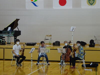 「東京nanairoアンサンブル」リハーサル 投稿日時 : 2022/08/31 学校サイト管理者 明日(9月1日)に体育館で行う芸術鑑賞で演奏していだく「東京nanairoアンサンブル」の奏者の方々が、午後から体育館でリハーサルを行われました。ヴァイオリン、オーボエ、ヴィオラ、チェロ、ピアノの奏者と歌の6名でのミニコンサートです。明日は、低学年(1・2年)が2時間目、中学年(3・4年)が3時間目、高学年(5・6年)が4時間目に鑑賞します。2日は、楓の森中でも公演されます。リハーサルの様子の動画はこちらから(動画)