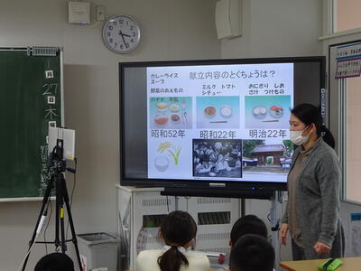 6年生の学活では、栄養教諭の橋本先生がTTでの授業をされています。「給食ができるまで」と題したプレゼンで、食材の搬入から調理、給食、片付けまでの一連の流れと衛生管理などについてクイズをおりまぜながら説明をされました。また、給食の献立で気を付けていることを紹介しながら、「食育」について子どもたちと一緒に考えていきました。