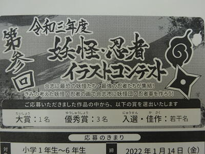 合志マンガミュージアム主催の「第参回 妖怪・忍者イラストコンテスト」が開催されています。小学校1年生から6年生を対象に、自分で考えた妖怪(ようかい)や忍者(にんじゃ)のイラストを応募できます。来年(令和4年)1月14日(金)までの応募となります。楓の森図書室前の廊下(マンガコーナー)に応募用紙と応募箱があります。