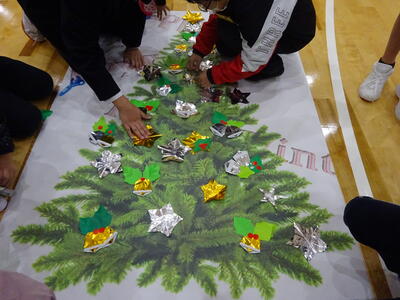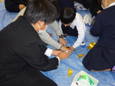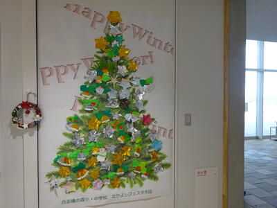 折り紙を使って星などを作る作業では、中学生が作り方を説明してくれ、小学生にやさしく分かりやすく教えてくれるなどとても頼りになる中学生のお兄ちゃん、お姉ちゃんと楽しいひとときを過ごしました。みんなで作り上げたクリスマスツリーは、その後、昇降口に掲示しました。
