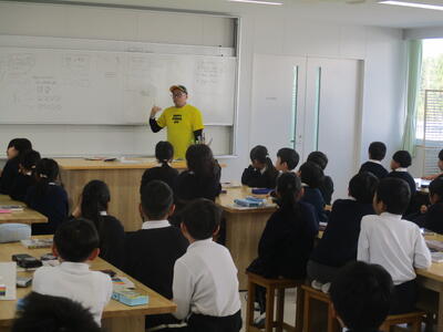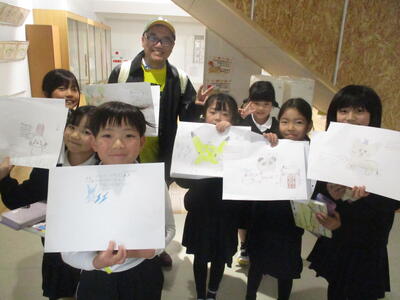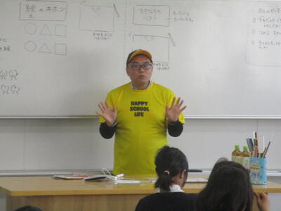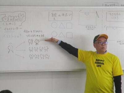 本日2年生の図画工作は、「自分が考えたお気に入りのキャラクターをつくろう!」ということで、講師に「TOMMYーZAWA(とみ・ざわ)」さんをお招きして、2年生全クラスに授業をしていただきました。「TOMMYーZAWA(とみ・ざわ)」さんは前回にひき続き2回目の来校になります。