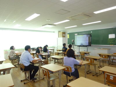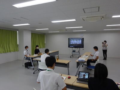 現在の状況を踏まえ、研究主任の岩田先生(小学校)と吉留先生(中学校)で協議され、研修は分散(サテライト)方式で行いました。大会議室を講師の方(配信)の会場とし、各学年ごとに教室(サテライト会場)に分かれての研修です。会場のオンライン環境は、情報教育担当の山下賢史先生(小学校)と井上先生(中学校)が設定を行い、各教室でのワークショップ等も行うなど有意義な研修となりました。