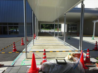 この「こうしのみち」の上履きルートのカラー塗装工事が今日からはじまりました。一時的に通行できなくなるため、学校閉庁日の期間を利用して10日(水)までの3日間で終了予定です。夏休み明けからは、より分かりやすくなり、子ども達の学校生活向上につながると思います。