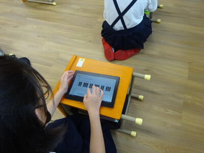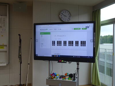 音楽専科の山下先生は、ICT支援員の板東さんに相談し、バーチャルピアノでの活動の準備を進めてきました。今日は、6年2組で実際にバーチャルピアノを使って授業が行われていました。子どもたちも鍵盤を押さえながら、音がでるバーチャルピアノでの練習で実感がわいていたようでした。
