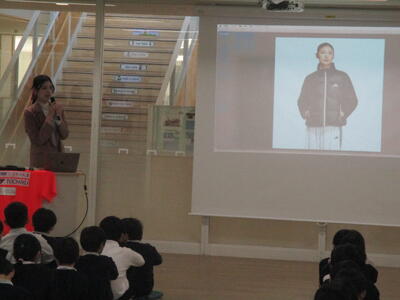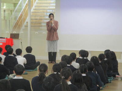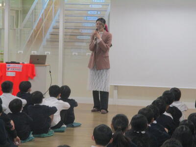 本校の校訓は、「志高く、道を拓く」、学校教育目標は、「夢を持ち、自ら考え、よりよく行動できる児童の育成」です。今日の松村さんのお話が、夢に向かって努力するためのエネルギーになったらいいなと思います。