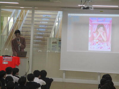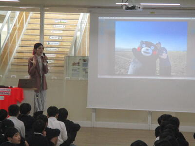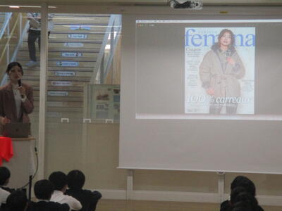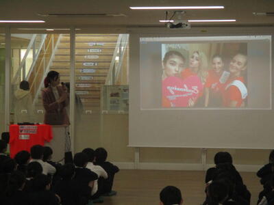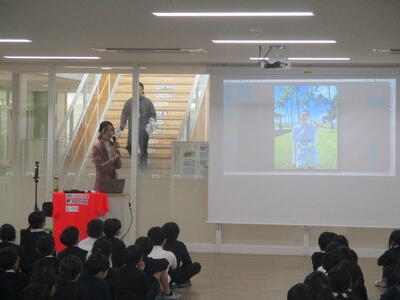 本日5校時、世界中で活躍しているファッションモデルである松村佳奈さん(香港在住)をお招きしてご講話いただきました。