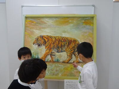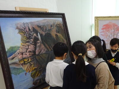 昨日から地域交流室で行っている菊池恵楓園絵画クラブ「金陽会」の展示会に、1年生や2年生が図工の時間や休み時間に見学をしています。