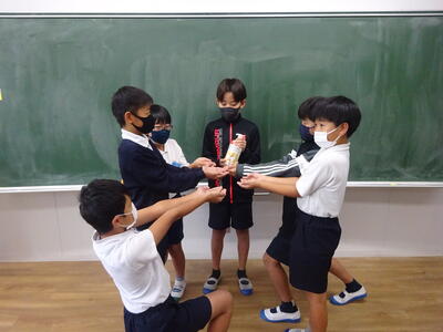 金賞の手洗い100%が3クラスもあり、手洗いが定着してきていることがうかがえます。入賞した各クラスには、香り付き?手洗い液入りボトルが次回まで貸し出されます。保健委員からのボトル贈呈では、受賞者が「手」を差し出して、手洗い液をもらうポーズで受け取っていました。さすが「手洗いコンクール」!です。