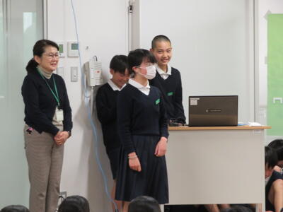 中学生になっても、同じ通学路を登校する子供たちがほとんどですが、この節目に感謝の気持ちを伝えることができて本当によかったと思います。暑い日も寒い日も、欠かさず見守ってくださるボランティアの皆様、大変ありがたい存在です。交通量の多い校区ですが、見守りのおかげで、大きな事故なく子供たちが登下校できています。改めて、この場を借りましてお礼申し上げます。1年間大変ありがとうございました。(主幹教諭 濱坂 由紀美)