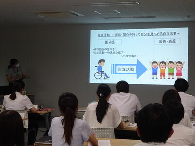 合志市教育委員会主催で、市内の初任者の先生方(19名)を対象にした初任者研修「地域理解」が行われました。その研修の一つとして「先輩教師に学ぶ」と題して、合志楓の森小学校・中学校の2年目(昨年度初任者)の先生の講話と教室等見学がありました。