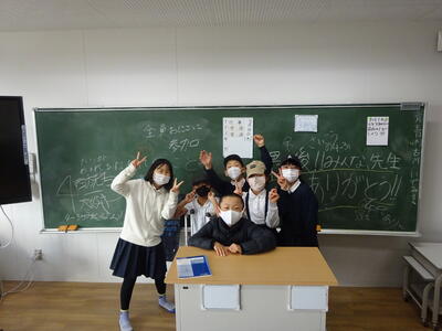 学級最後の日の朝の教室。いくつかの教室を回ると、黒板には担任の先生からのメッセージが書かれていました。また、子ども達がメッセージを書いたり、担任の先生あてに「担任卒業証書」を作成したり、一年間を振り返るプレゼンをタブレットで作って担任の先生を迎えたりと、思い思いの学級最後の日を過ごしていました。