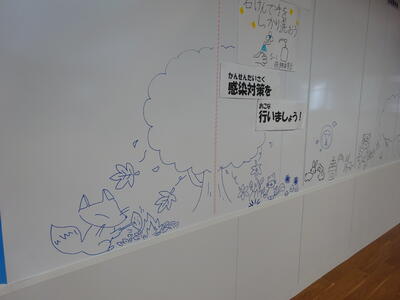 楓の森小・中学校校舎の自慢の一つに1階ロビーにある巨大なホワイトボード。昇降口から入った場所で多くの子ども達が取りますが、特に小学校1年生の教室の脇にあり1年生にとってはなじみのある場所でもあります。
