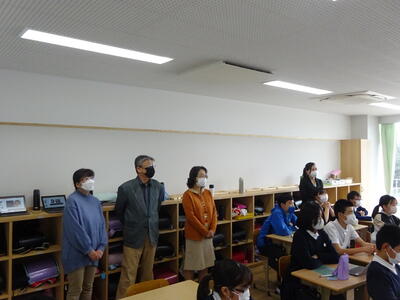 今回は、学校の取り組みや学校評価アンケートなどについて説明後、校内を巡回していただき授業や子ども達の様子を見ていただきました。ちょうど6年生の「未来の私」の作品展示やプレゼンテーションでの発表などの卒業生の姿を見ていただくこともできました。