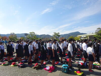 午後からの学習。まずは、平和公園の平和祈念像前での平和集会です。担当の子ども達の進行で、各クラスの千羽鶴の献鶴を行った後、全員で黙とうをささげ、平和の誓いをみんなで行いました。最後には「ナガサキのある国で」を歌いました。