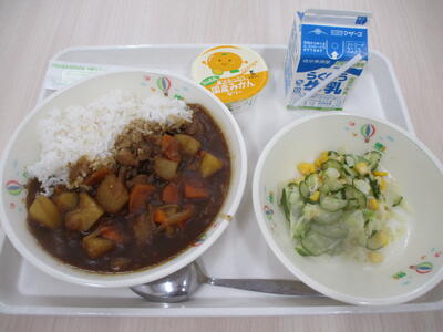チキンカレー、牛乳、グリーンサラダ、みかんゼリー