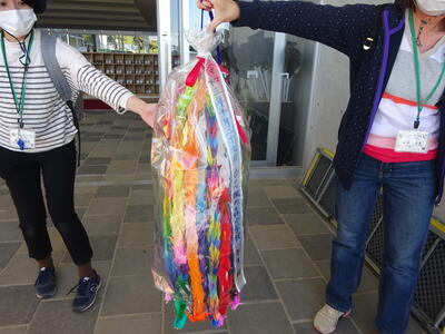 今回、1年生は、動物園でこれまで亡くなった動物たちの慰霊碑に献鶴をするために、みんなで折った鶴を持って行きます。初めて鶴を折る子どもたちも四苦八苦しながら頑張って折った鶴を教育活動指導員の田中先生、浪花先生、谷口先生が一つずつ糸でつなげてくれました(個性的な鶴も多くつなげるのにも技が必要だったようですが・・)。今日は、1日、いろんな動植物とふれあい、楓の森小の友だちと一緒に学習しながらいい思い出を作ってくれることと思います。