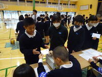 6年生が社会科の授業の一環で合志市選挙管理委員会と明るい選挙推進協議会の協力の下「出前選挙授業」を行いました。冒頭は、選挙管理委員会の方から説明を受け模擬投票を行いました。模擬投票は「憧れるのをやめましょう。自分の一票でつかめ給食総選挙」ということで、6年の担任の先生方が立候補者よろしくそれぞれのメニューの応援演説を行いました。その後は実際に投票と開票を行いましたが、1番目の投票者が立会人と空の投票箱を確認するところから実際の選挙と全く同じ体験を行いました。今回の投票では「ホットドッグ」がトップ当選で(他は「カレー・ナン」「やきそばパン」「たこやき」がありました)今後給食のメニューとして出されることになるそうです。(教頭 米澤)