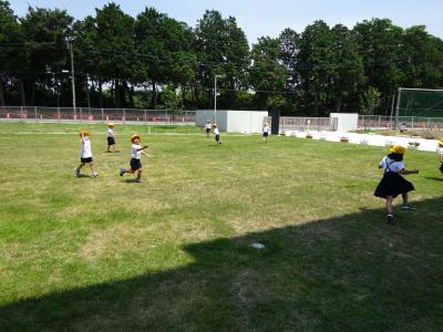 校舎の東側(東門から入った右側)は、子どもたちにも開放されている場所です。芝生のため、地面からの照り返しもいくぶんかやわらかく、ほどよいクッションのため、1年生の鬼ごっこの場所として子どもたちが走り回っています。休憩は校舎側の日陰があり、遊ぶ場所としてはいい広場となっています。