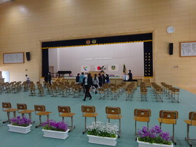 明日(23日)の卒業式の準備を午後、5年生と先生方で行いました。5年生は、6年生教室や靴箱の飾り付けや昇降口やこうしの道の掃除、体育館の式場の設営と大活躍でした。明日の卒業式を6年生が気持ちよく過ごすことができるよう楓の森小みんなで心を込めて準備をしました。