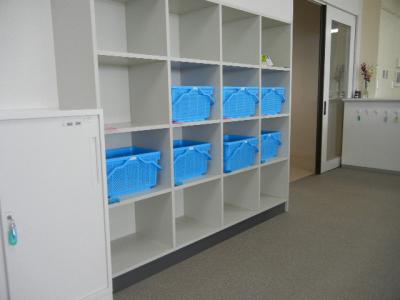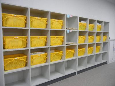子どもたちが運びやすいように、各クラスのプリント配布用のかごも開校後にそろえたものの一つです。