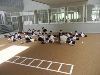小学校の校長室も探検。1年生の教室横の「遊び庭」でごろんと転がる1年生。気持ちよさそうです。
