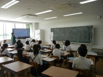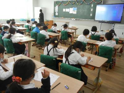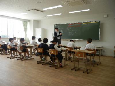 中学校数学の教員免許を持っている6年3組の宮田先生が、中学1年生の数学の授業(少人数)を受け持ち、その間、中学校の英語担当の坂本先生が6年1組の外国語の授業を行っています(数学の免許を持っている5年生の永田先生も中学校1年生数学の少人数を担当しています)。