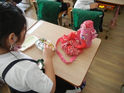 本来は、今日、歓迎遠足の日でしたが、県内の状況から感染拡大防止のため中止となりました。しかし、給食がないため「弁当の日」です。机に広げられたお弁当も色とりどりで、いつもとは違った給食の時間となりました。