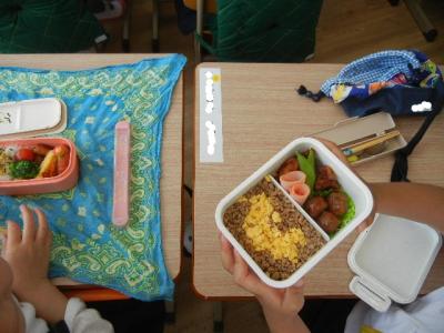 教室に行くと、「ほら、ハートだよ」と、そぼろご飯で作られたお弁当をうれしそうに見せてくれる1年生もいました。これからも時折、お弁当の日がありますので、よろしくお願いします。
