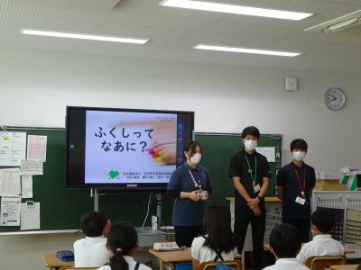 今日は、合志市社会福祉協議会から3人(北村さん、黒川さん、桂さん)に来校いただき、1組と2組で福祉についての授業を行っていただきました。