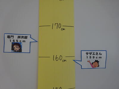 今、保健室前には200㎝!まではかれる身長計が掲示されています。「トトロ200㎝」「竈門炭次郎165㎝」「サザエさん159㎝」「ドラえもん129.3㎝」「ぐりとぐら10㎝」が比較対象として掲示され、子どもたちも楽しく背比べをしています。