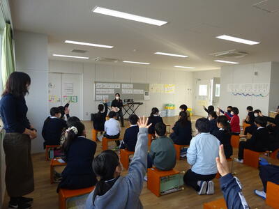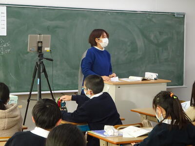 4年生の音楽「日本の楽器」の学習では、ゲストティーチャーが音楽室に来室。今回のゲストティーチャーは、事務室の上田先生です。趣味で三味線を習われていたこともあり、音楽の山下先生からオファーで、実際に演奏をすることになったそうです。「さくら」などを演奏してもらいました。CD等で聴くこともできますが、やはり生で聴けるのはいいなと思います。先生方のまた違った一面を見られるのもいいです。中学校の音楽では、琴の演奏を行っていきます。