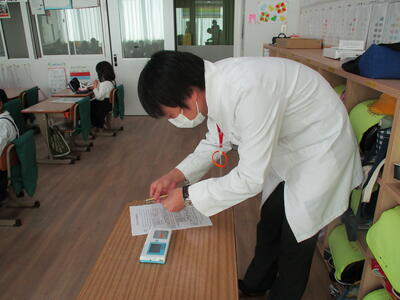 学校保健安全法に基づいて、教室等の環境衛生検査(換気、保温、採光、照明、騒音など)を行っています。昨日(18日)は、換気の状態を学校薬剤師の椎屋久生先生に二酸化炭素濃度の測定をしてもらいました。いずれも基準値以下の結果で、学校環境衛生基準をみたしており、十分換気ができている状態でした。