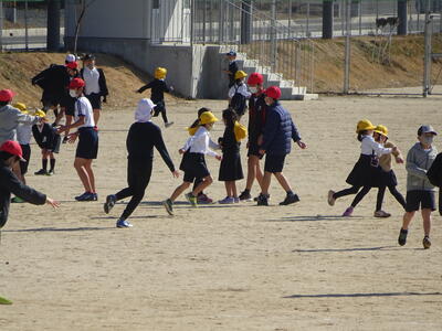 その後、1年生は蜘蛛の子を散らすように走って逃げていきます。それを優しくペースを合わせて追いかけていく6年生のお兄ちゃんお姉ちゃん達。頼れる6年生です。あと2か月あまりで卒業、中学生になると思うと小学校としてはさみしくなります。