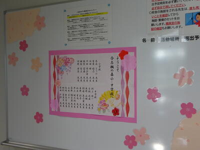 4月1日、新年度がスタートしました。職員玄関には、本日から楓の森小と楓の森中学校に勤務されることになった先生方を歓迎する掲示がされています。