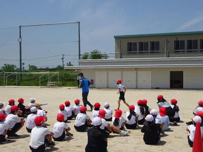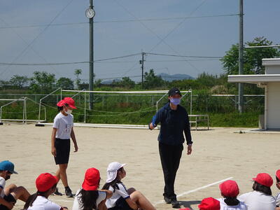 6年1組と3組の体育は、中学校の先生に授業をしてもらっています。1組は山本先生、3組は井上先生です。運動会前などは、小学校の学級担任が行いますが、その他の体育は中学校のお二人の先生が授業をされます。今は、リレーの授業ですが、バトンの渡し方など、専門ならではのアドバイスを受けながら授業が進められています。