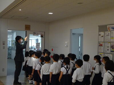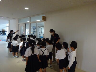 1年生は、生活科の学習「がっこうたんけん」がはじまりました。今日は、校舎の1階を各クラスでたんけんをしていました。保健室や職員室、校長室、事務室、技術室などをたんけんしました。職員室の入り方も練習しながらのたんけんです。色々な部屋をたんけんしながら、部屋のやくわりや先生の紹介などの説明を聞いていました。楓の森は、小・中同居のため、通常、小学校にない特別教室(技術室)や武道場などもあり、1年生にとってはワクワクするたんけんとなったのではと思います。来週は校舎2階のたんけんが予定させています。