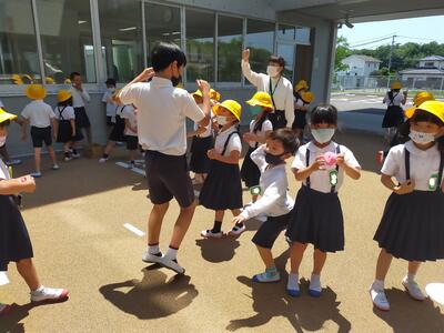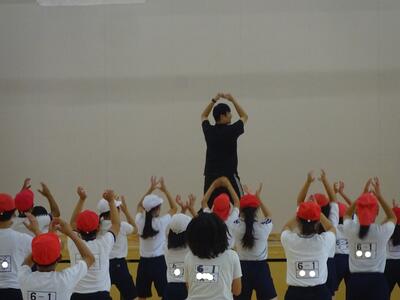 1年生の4時間目の音楽の時間。授業の最初には、明日、運動会種目の「チェッコリ玉入れ(プログラムNo.7)」の踊りの練習が行われていました。玉入れの間に1年生が音楽に合わせた踊りは、とてもかわいくて、見ている人が自然と笑顔になるほどです。3組の子ども達が練習しているときには、英語専科の塩山先生も見に来られるなど、観客も数名いて子ども達もノリノリで踊っていました。