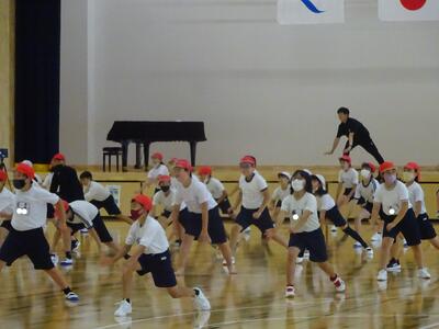 運動会で踊る「花笠音頭」の練習を3年生が体育館で行っていました。ステージ上では桑原先生が動きを一つずつ確認しながら指導をされていました。本番に使う花笠も子ども達一人一人が制作中です。練習では、赤白帽を花笠に見立てて踊りの練習に励んでいました。