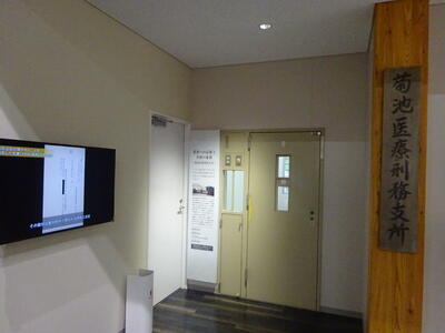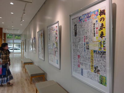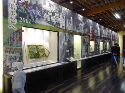 テープカット後に、歴史資料館内の見学会が行われました。「わたしはあなた あなたはわたし」をコンセプトに人と人をつなぐ資料館となっているとの話のとおりの展示や映像をまじえたものでした。本校が建設される前にあった菊池医療刑務支所も一部移設展示されています。2月に本校で行った自治会絵画クラブ金陽会の絵画などの展示もありました。また、昨年度、熊日壁新聞コンクールで受賞した合志楓の森中2年生が菊池恵楓園やハンセン病問題について取材し制作した壁新聞3作品の展示もありました。楓の森中でも紹介がされています(関係ページにジャンプ)