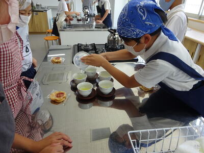 お茶はペットボトル!が日常化している中、「湯飲み」や「急須」を初めて見たという子どももいて、改めてお茶の入れ方や急須の使い方などを学習していました。子ども達は思わず「いい香り!」とつぶやくなど、日本茶のよさを実感で来たのではと思います。お茶菓子のせんべいもあり大満足の子ども達でした。ぜひ、ご家庭でも復習?!をお願いします。