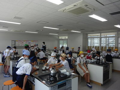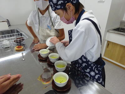 今日は、4組が調理室で日本茶を入れていました。ガスコンロなど調理器具など調理の基礎を学習する一つで、今回は日本茶をいれていました。