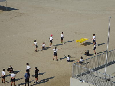 昼休みに1年1組の子ども達がベランダから運動場に向かって「あかだん がんばれー!!あかだん がんばれー!!」と叫んでいました。子ども達が応援している運動場をみると、中学1年生が「玉入れ」の練習をしていました。