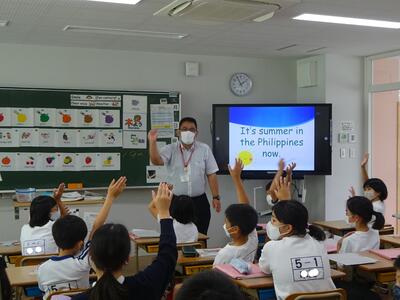 昨年度までは合志市内の他の学校を担当されていたラルフ先生が、今年から楓の森小・中を担当されます。今日は、初めてということで、ラルフ先生がプレゼンを使って質問を交えながら自己紹介をされていました。家族や母国フィリピンの紹介など、子ども達から初めてしるフィリピンの食べ物や自然、生活に「おー」「すごーい」と声があがっていました。まさしく異文化交流でした。