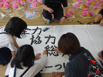 今年の運動会スローガンは「全力 協力 総力 ~心を一つにベストをつくす」です。企画委員会が各クラスからだされた案をもとに決まりました。昼休みや放課後を使って企画委員会が広用紙にイラスト入りでスローガンを作成してくれました。