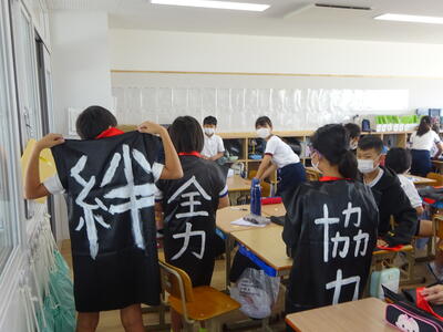 運動会のスローガンは、各学級からだされた案を企画委員会で検討して決まりました。今年のスローガンは