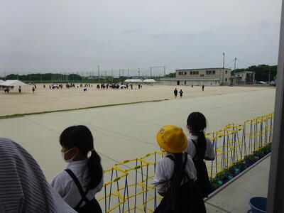 中学校のご厚意で希望する本校6年生は特別に観覧場所をもうけてもらいました。開会式前から6年生の子ども達はプログラムを手に中学生の競技を楽しみにしています。