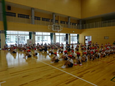3時間目に体育館で1・2年生合同で交通安全教室を行いました。合志市役所の交通防災課から小島さんと和田さんに来て頂き、横断歩道の渡り方や登下校時の注意事項について、ビデオや実際に横断歩道(模擬)を渡って練習をしました。