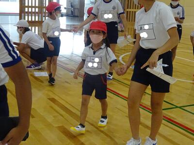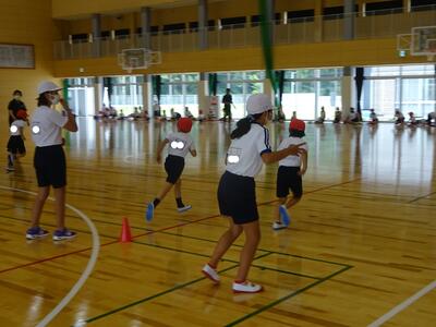 シャトルランは持久力を測るもので、20m間隔を5秒間隔で往復してその回数をカウントしていきます。1年生には説明しただけでは分かりづらく、まずは6年生が手本を見せてくれました。その後、6年生が補助に入って、1年生をサポートしながらシャトルランを行いました。頼もしい6年生です。