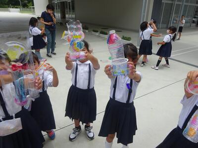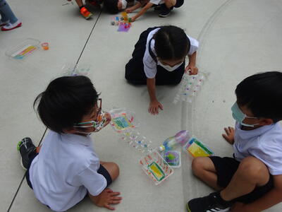 2年生の図工では「ひかりのプレゼント」と題した工作をしていました。卵のパックやペットボトルなどプラスチックの透明な容器に色づけをしたり組み合わせたりした作品を屋外で光にあててたりしながら楽しむ(鑑賞)する活動です。